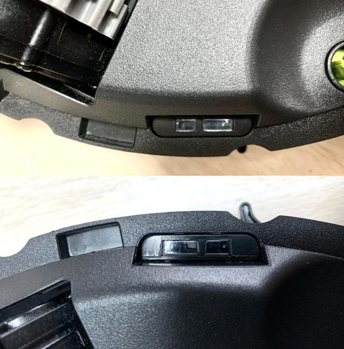 DG710侧边特写,顶图中间黑色区域为红外滤光片,其作用为减少环境光对红外传感器的干扰,以便更好的探测前方路障情况;底图可见横向黑色椭圆形区域的是红外辅助回充传感器滤光片,其作用为更好的找寻与对接充电底座,另外,其周边呈Y字形设计的为排风口,除了帮助内部器件散热外,还可以避免出风时吹动垃圾并减少出风噪音。