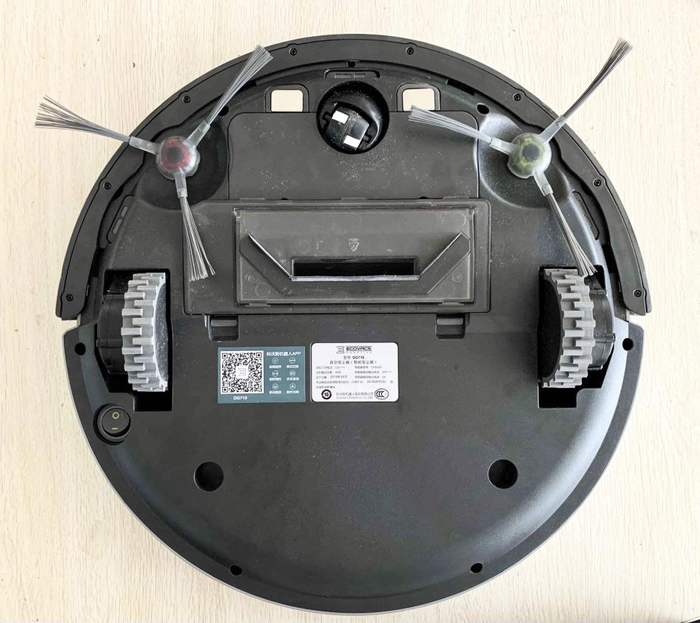 DG710底部特写,底部主要是采用对称式设计,标贴显示该款产品的相关参数、厂家信息及各种认证标准。左侧下方有一个总电源开关推键,正前方中间为万向轮,主导前进方向,两边是充电对接触片,左右各自一个可拆取三页边刷以及固定驱动轮。