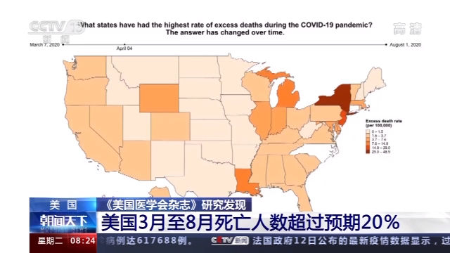 《美国医学会杂志》12日发布的演示动画显示了在2020年3月至8月期间,美国各州超额死亡率较高地区的变化趋势,其中颜色最深的红色代表最高值。超额死亡率是一个地区某段时间死亡人数与其他年份同期通常死亡人数相比的结果。研究显示,从3月至8月,美国全国死亡总人数为1336561人,比预期多出20%,其中超过六成是由新冠肺炎疫情导致的。