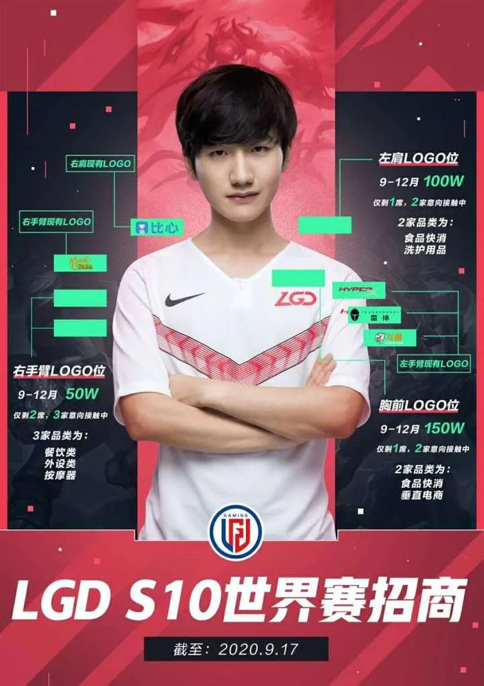 以4号种子、LGD战队的招商价格为例,队服胸前LOGO叫价150万元,左右肩(共4个)、左右手臂(共6个)LOGO的价格分别为100万元和50万元,位置供不应求。