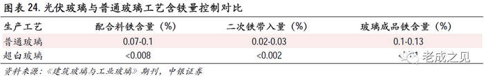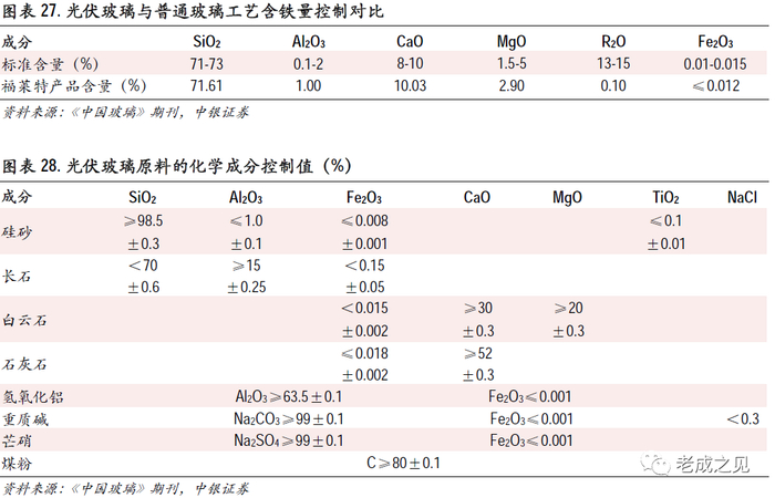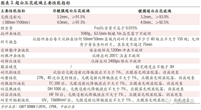低铁高透是光伏玻璃与普通玻璃的主要区别:与普通玻璃相比,光伏玻璃最大的特点为具有低的Fe2O3含量及高的光伏透射比。国标规定超白压花玻璃Fe2O3含量应不高于0.015%,而普通玻璃的铁含量约为其10倍;非镀膜3.2mm、镀膜3.2mm超白压花玻璃光伏透射比分别应不低于91.5%、93%,而普通玻璃(3.0mm)的透射比一般低于光伏玻璃5-7个百分点。此外,光伏玻璃对抗冲击性能、耐热性能、耐湿冻性能、耐磨性能、颜色均匀性等品质的要求也高于普通玻璃。