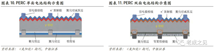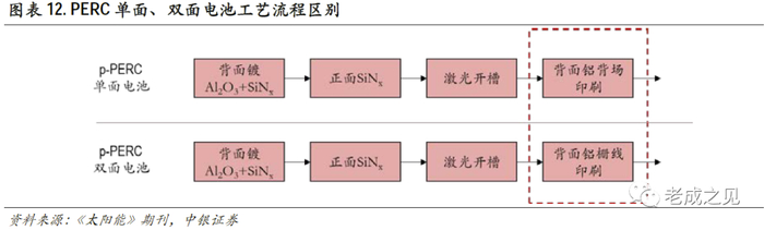 PERC电池可顺利切换双面:双面PERC电池是在单面电池的基础上进行了改进,优化了丝网印刷工艺,在背面的激光开孔处丝网印刷铝浆并烧结形成铝栅线来代替单面电池的全铝背场结构。两种电池工艺路线接近,产线兼容度高,对单面电池产线稍加改造即可大规模量产。根据EnergyTrend,产线改造主要是提高背面电极栅格印刷设备及激光设备的精度,产线更新只需2个月左右,成本增加仅2美分/W。当前主流的单晶PERC电池在应用之初以单面为主,目前主要电池片制造企业均已具备双面PERC电池的生产能力。