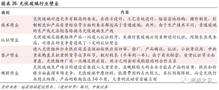 光伏玻璃具有较高的行业壁垒:光伏玻璃技术壁垒较高,长期技术经验积累和完备的工艺流程构成了非玻璃生产企业进入光伏玻璃行业的主要障碍。此外,与普通玻璃生产线相比,超白玻璃生产线在料方设计、配料工艺、窑池结构、熔化工艺、控制流程等方面均有更高要求,普通玻璃的生产线无法轻易转换为光伏玻璃生产线。除技术壁垒外,光伏玻璃行业还具有认证、客户、规模等方面的进入壁垒,形成了新进入者寥寥的整体格局。