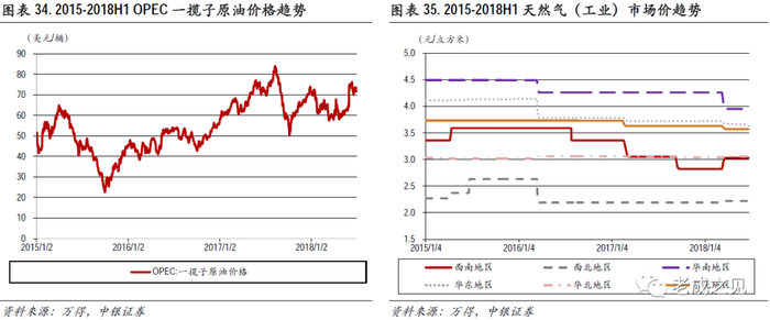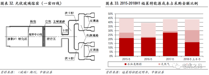 石油类燃料是影响燃料成本的主要因素:燃料成本一般占光伏玻璃总成本的30%-40%,其中电力和天然气由市政供应,为政府指导价,各地价格略有不同,总体而言较为稳定,而石油类燃料受国际原油价格影响波动较大,价格也更难判断,因此是成本变动的最主要来源。一般而言,每吨石油焦价格下降100元,每重箱玻璃生产成本下降1.06元。为尽量降低石油类燃料价格大幅波动对成本的影响,行业内许多公司装配石油类燃料和天然气双燃料系统,可根据石油类燃料和天然气的价格效益比合理选择燃料结构,且近年来受制于环保压力,厂商越来越重视天然气的使用,如福莱特最新设计的1,200吨/日熔炉以天然气为主要燃料,石油类燃料为备用系统。以福莱特为例,虽然尽管2015-2018H1期间,原油价格波动超过了240%,但总体上燃料动力费用占采购金额的比例在39%-45%之间波动。