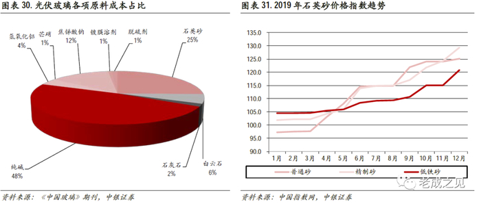 原料成本主要受纯碱影响:原料一般占光伏玻璃成本比重30%-40%。在原料中,纯碱占比接近50%,石英砂超过25%,其他原材料成本不足25%。石英砂价格波动相对较小,一般随CPI波动,此外,一些企业为了保障原料供应安全,锁定石英砂采购成本,直接投资相关矿产,如信义光能控制了部分广西北海、广东河源的石英砂资源,福莱特拥有安徽凤阳储量1,800万吨的优质石英砂采矿权等。因此,纯碱是影响光伏玻璃成本的主要因素之一。纯碱上游为原材料盐与氨气,成本相对较为稳定,价格变化主要受下游需求影响。纯碱下游有玻璃、无机盐、氧化铝、玻璃、洗涤用品等行业,其中玻璃消耗纯碱占比达55%,对纯碱的价格影响最大,因此总体上纯碱价格走势与玻璃需求有一定相关性。