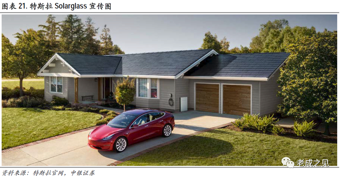 特斯拉Solarglass实现屋顶组件一体化:2019年10月,特斯拉正式推出第三代光伏屋顶产品Solarglass。相对于前两代产品,Solarglass保持了在钢化玻璃中镶嵌光伏电池的结构,可以承受110英里/小时的风和直径近2英寸的冰雹,可直接替代传统屋顶瓦片,实现屋顶与发电组件的一体化,而非在已有屋顶瓦片上进行叠加安装,整体视觉效果相对于旧产品更为美观。此外,Solarglass提高了功率密度,每块瓦片中的零件减少了一半,从而大大降低成本。同时第三代太阳能屋顶的安装时间和难度均有所降低,使大规模安装成为可能。