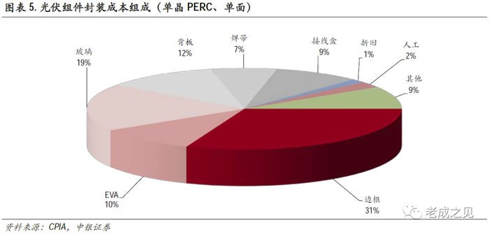 光伏玻璃约占组件封装成本的20%:随着光伏主产业链成本的持续下降,以辅材成本为主的封装成本逐步成为光伏组件成本的主体。根据CPIA等行业机构统计,目前光伏组件封装成本在总成本中的占比已接近50%,其中光伏玻璃在组件封装成本中的占比已达到约20%。
