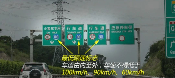 同方向有2条车道的,左侧车道的最低车速为每小时100公里;同方向有3条以上车道的,最左侧车道的最低车速为每小时110公里,中间车道的最低车速为每小时90公里。道路限速标志标明的车速与上述车道行驶车速的规定不一致的,按照道路限速标志标明的车速行驶。