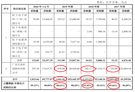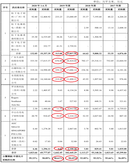 另据招股书披露,可比前三年内,生益电子主要向7家供应商采购覆铜板/半固化片,向7大供应商合计采购量占当期该类原材料采购总量之比分别为95.66%、93.85%和98.61%。其中,向控股股东生益科技的采购量分别为752.69万平米、702.17万平米和676.80万平米,占7大供应商合计采购量之比分别为73.53%、63.07%和41.21%,即占当期覆铜板/半固化片原材料总采购量之比为70.34%、59.19%和40.63%。2017年和2018年,生益电子的覆铜板/半固化片采购对生益科技存在严重依赖,2019年的采购占比也依然不低。