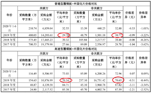 招股书显示,2019年度,生益电子主要采购普通型和高速型两类覆铜板/半固化片。其中,公司向关联方采购普通型覆铜板/半固化片的平均单价为29.78元/平米,向非关联方的采购单价为30.77元/平米,非关联方采购单价比关联采购单价高3.32%。此外,公司向关联方采购高速型覆铜板/半固化片的平均单价为70.34元/平米,向非关联方的采购单价为70.65元/平米,非关联方采购单价比关联采购单价高0.44%。无论是采购普通型覆铜板/半固化片,还是采购高速型覆铜板/半固化片,关联采购单价与非关联采购单价的差异都比较小,与上述公司向其他5大供应商的平均采购单价远高于生益科技的结果,存在非常明显的差异。
