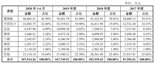 招股书显示,2017年到2019年,生益电子采购覆铜板的金额分别为3.46亿元、4.13亿元和7.03亿元,占当期采购总金额之比分别为38.51%、39.91%和41.90%。公司采购半固化片的金额分别为1.25亿元、1.64亿元和3.35亿元,采购金额占比分别为14.31%、15.85%和19.98%。覆铜板和半固化片合计采购占比为53.82%、55.76%和61.88%,两者在生益电子原材料采购总金额中的合计占比始终超过50%,并且持续升高,是生益电子开展印刷线路板业务最主要的原材料。