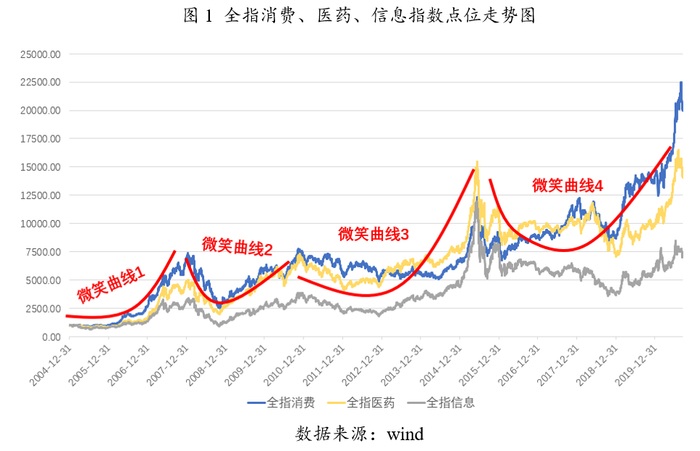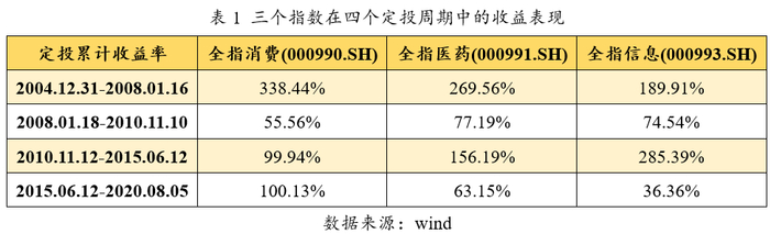 从表1可以看到,这三个指数在四轮定投中各有亮点:全指消费在第一个微笑曲线(2004.12.31-2008.01.16)和第四个微笑曲线(2015.06.12-2020.08.05)中表现最佳;全指医药在四轮定投中表现都很好,尤其是它的第二个微笑曲线(2008.01.18-2010.11.10),定投累计收益率在三者中居于首位;全指信息则是在第三个微笑曲线(2010.11.12-2015.06.12)中表现突出,累计收益率分别接近全指消费的三倍、全指医药的两倍,但第四个微笑曲线(2015.06.12-2020.08.05)表现就不尽如人意。
