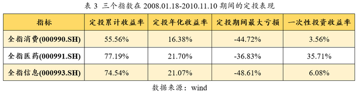 由表3可知,在2008.01.18-2010.11.10第二个定投微笑曲线中,全指医药的表现最佳,累计收益率为77.19%,年化收益率为21.70%,且定投期间的最大亏损在三个指数中最少;全指信息的累计收益率与全指医药接近,为74.54%,但定投期间的最大亏损达到了将近一半;全指消费累计收益率为55.56%,表现最差,但因为该时期指数点位走出了微笑曲线,定投的收益率显著高于一次性投资收益率。
