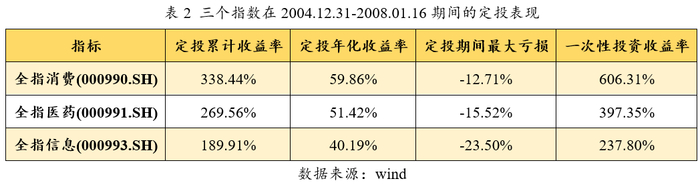 由表2可知,在2004.12.31-2008.01.16第一个定投微笑曲线中,全指消费不仅在三个指数中累计收益率最高,达到338.44%,收益率年化后高达59.86%,而且定投期间的最大亏损最小,仅为-12.71%;全指医药表现次佳,但累计收益率仍高达269.56%,年化收益率也超过50%;全指信息虽然表现最差,其累计收益率也达到了189.91%,年化收益率为40.19%。整体上看,第一个微笑曲线中三个指数的定投收益率表现都很好,但因为这个时间区间三个指数的走势都几乎是单边上涨,所以定投收益率都小于一次性投资收益率。