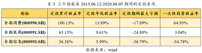 由表5可知,在2015.06.12-2020.08.05第四个定投微笑曲线中,全指消费的表现最佳,累计收益率为100.13%;然而从定投累计收益率与一次性投资收益率相比的角度看,全指医药定投累计收益率比一次性投资收益率高60.12%,全指信息定投累计收益率更是比一次性投资收益率高71.14%,由此可见虽然在这段时期全指医药和全指信息的定投收益表现不如全指消费,但只要进行定投,这两个指数的收益率还是远高于一次性投资的。