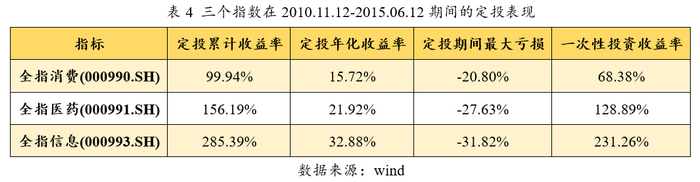 由表4可知,在2010.11.12-2015.06.12第三个定投微笑曲线中,全指信息虽然在中途最大亏损达到-31.82%,但最终得到的累计收益率远高于另外两个指数,为285.39%,年化收益率高达32.88%;全指医药累计收益率也达到了156.19%,定投期间最大亏损比全指信息略少,为-27.63%;全指消费在三者中表现最差,累计收益率为99.94%。在这个时间段里三个指数的点位走出的微笑曲线并不是很灿烂,但定投的收益率仍显著高于一次性投资,体现出定投的优势。