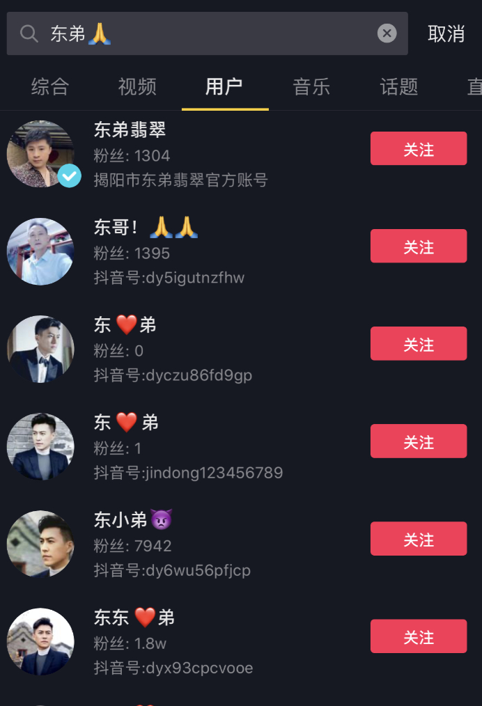 记者查询发现,目前仍有众多“假靳东”账号活跃在短视频平台上,相关账号多达数百个。此类账号除了头像使用了靳东的照片外,名称也多为“靳东、东弟、靳东弟、东东弟、东哥”等类似的字眼。