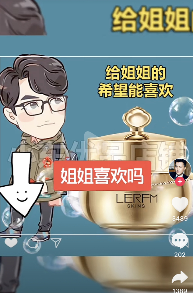 以其中一名为“东老弟”的“假靳东”账号为例,其粉丝数已高达3.4万,置顶的视频卖的是一款名为“LERFM”的化妆品。记者查询发现,该品牌中文名为“蓝尼芳可”,是一个微商代言的护肤品品牌。