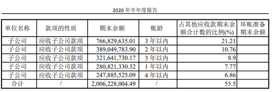 2020半年报显示,截至2020年上半年末,人福医药的账上仍然有38.31亿元商誉,是该公司2019年8.4亿元净利润的近5倍。与此同时,公司来自子公司的应收款项合计约20.06亿元。