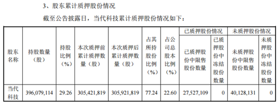 此前的9日,该股东刚刚质押了300万股,占公司总股本的0.22%。截至目前,当代科技持股数量为3.96亿股,累计质押约3.06亿股,占其所持股份比例为77.24%,占公司总股本比例为22.6%。