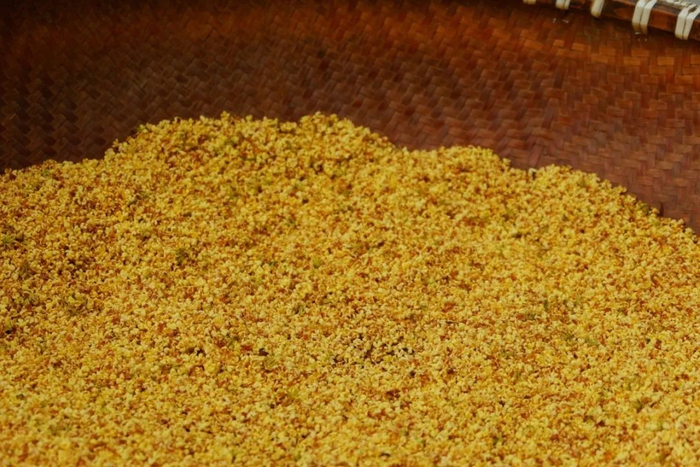 窨制时,制茶师们要先在洁净的竹垫或白布上铺放一层茶坯,然后按原料配比量均匀加放一层桂花。