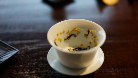 桂花九曲红梅,以茶为骨,以骨凝香,手工古法窨制。新鲜的桂花和茶叶相互拌和,再放入生石灰中,足足等待 24 小时。