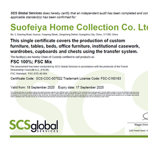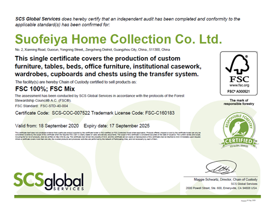 FSC国际认证考核过程十分严格。获得该证,意味着索菲亚从原材料采购、仓储、生产到销售等环节都已经通过了链条监管与确认,确保木材来自于一个已经认证过的森林,即来自一个优质管理及可持续开发的森林,极力地降低了对环境对森林造成的影响,同时也是对索菲亚产品及生产链条的高度认可。