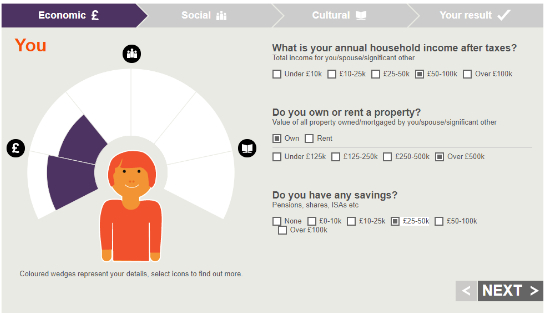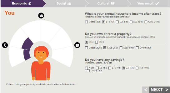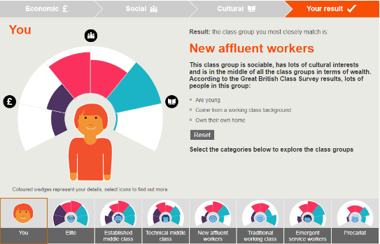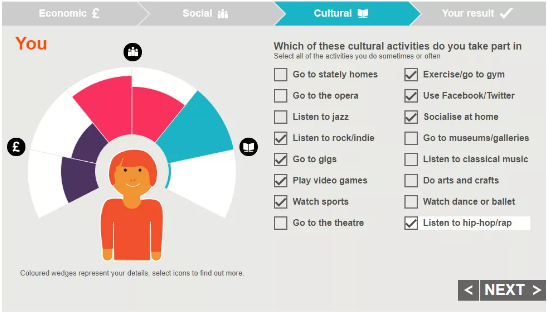 所以无论你在哪个国家,即使富有也有相应的交际圈,如果想在英国被划分成精英阶层(注意观察elite划分的标准蓝色扇形块,文化活动部分是很满格的),就需要多参加一些文化活动。保留一线城市的财富和交际圈信息不变,文化活动只保留在家社交和使用社交媒体这两项,其他的都不选,那么划分结果还是精英阶层,果然财富在大部分时间仍然是硬道理。