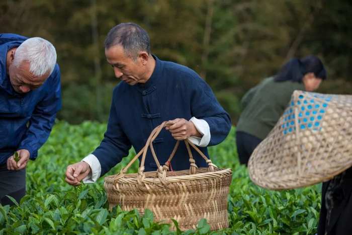 徒手采摘随后竹筐盛装、悉心贮运,经萎凋干燥后方成白毫银针。