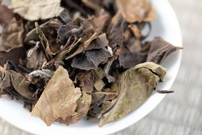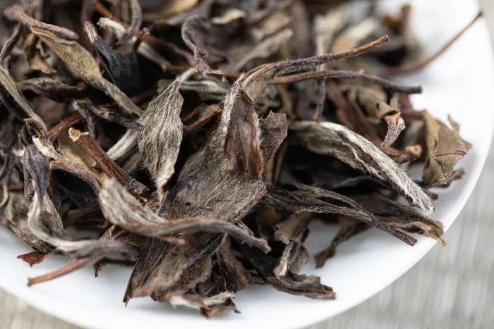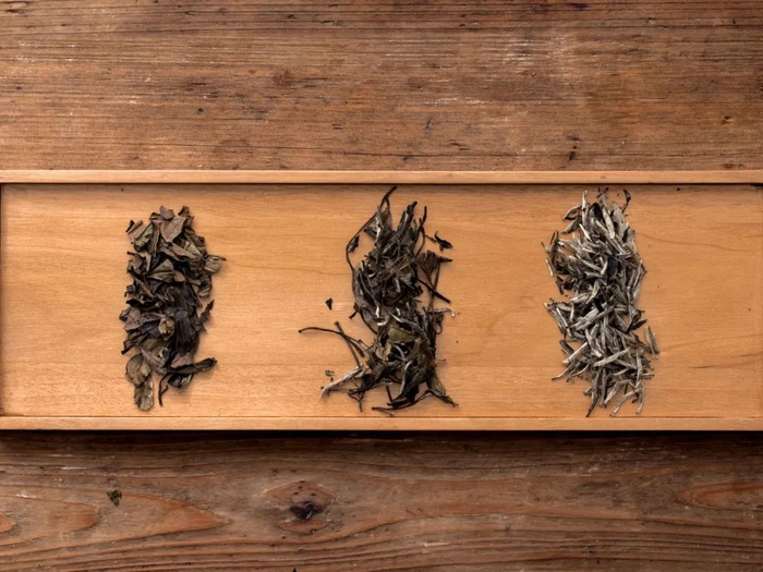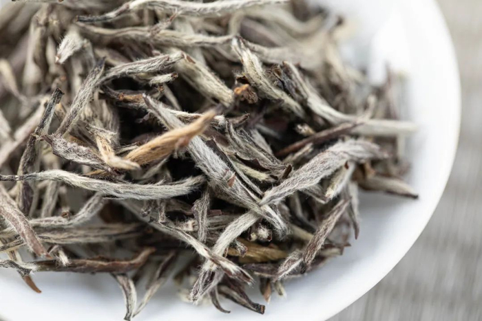 上等白牡丹芽头处带着细短浓密白毫,叶片细窄如柳叶。