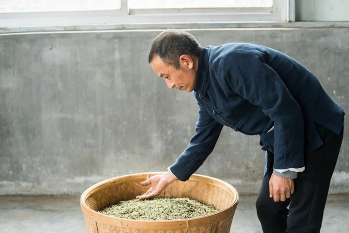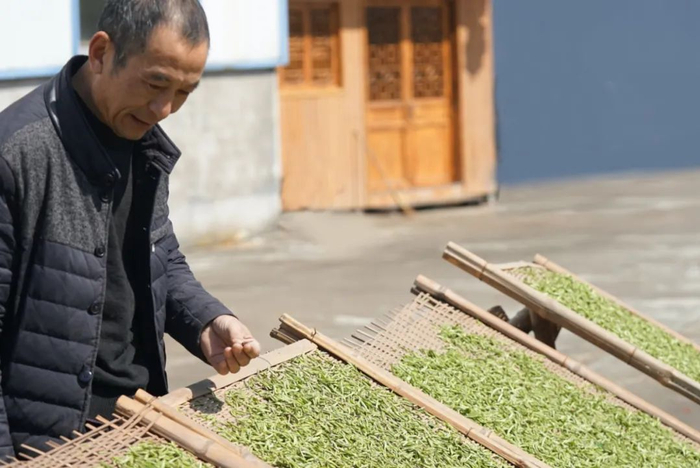 将鲜叶一片片薄摊放在竹席上并置于微弱的阳光下,自然晾晒脱水,含水量须严格在72小时内降至25%以下。