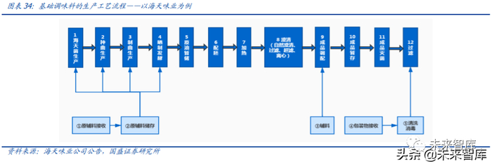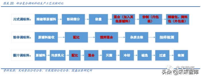 从行业进驻门槛来看,基础调味料注重生产工艺和产地,复合调味料注重配方和原材料。根据专业划分法,复合调味料的生产方法主要包括发酵提取型、分解反应型和原料混配 型。其中原料混配型复合调味料相对常见,主要应用于终端(C 端及餐饮)渠道。我们 梳理了天味食品、日辰股份主要产品的生产流程,可以发现二者均采用原料混配型的生 产方式。原料配比、混合以及炒制是相对关键的生产环节。而对比基础调味料,我们以 酱油为例,生产工艺主要包括日式(以龟甲万、千禾为代表,高盐稀态控温发酵)和广 式(以海天、厨邦为代表,日晒夜露天然发酵)两种,菌种生产、制曲、晒制为关键环 节,相对来说难以被复制。