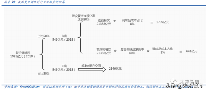 C 端:根据 Frost&Sullivan 的统计,我们对标日美人均复合调味料的支出水平,2018 年 我国人均年复合调味料支出金额约 9.3 美元,而日本及美国人均年复合调味料支出金额 分别约为 87.7 美元、85.5 美元。我们综合考虑我国与日美的饮食习惯差异,中性假设我 国复合调味料人均年支出达到日本人均支出约一半的水平(假设 40 美元/人/年),则相较于目前的人均支出有超 3 倍提升空间,预计 C 端复合调味料市场空间约为 2346 亿元。