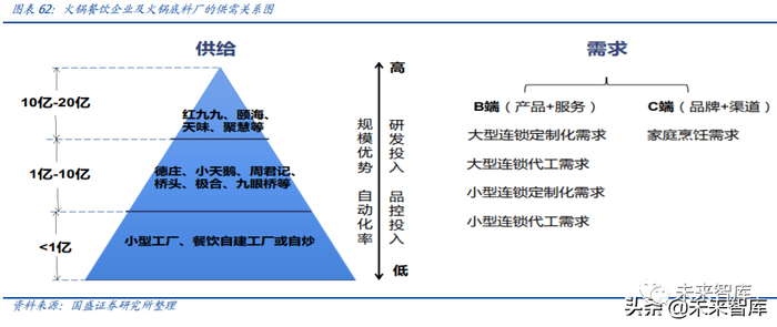 我们从整个火锅底料产业链的供需角度来看:供给端,除天味食品、红九九等相对大型 火锅底料厂以外,川渝地区仍充斥较多小型规模的火锅底料厂,按营收规模由大到小排 序,火锅底料厂商数量呈金字塔型。需求端,B 端连锁餐饮为复合调味料的主要需求方, 其中大型连锁连锁餐饮主要为定制化需求,小型连锁餐饮主要为代加工需求。
