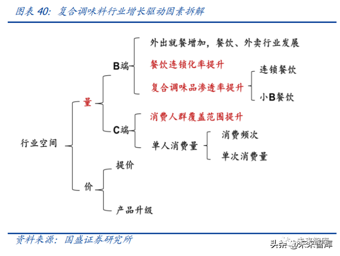 同时我们对行业空间进行量价拆分,可以看到 B 端的量增基础来自餐饮连锁化率、复合 调味品渗透率提升两个方面,同时消费人群覆盖范围扩大成为 C 端增长的主要驱动力。