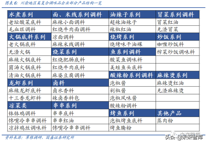 从整体的复合调味料的结构来看,鸡精仍为我国复合调味料的最大组成部分,其次为火锅调味料。相较于日本调味品消费结构,我国复合调味料品类仍有较大的扩充空间。从 应用场景上来看,复合调味料的使用场景较为多元,根据我们的草根调研,川渝地区某 复合调味料企业的产品系列多达 20 余种,除火锅底料产品外,还包括水煮系列、烧烤 系列、串串系列、卤料系列等。