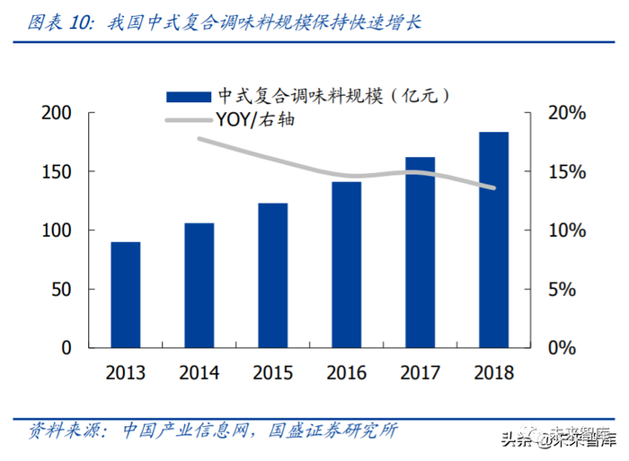 我们认为量增是主要驱动因素。根据 Frost&Sullivan 的统计,2018 年我国复合调味料市 场规模为 1091 亿元,近几年来行业规模保持双位数高增,2013-2018 年复合增速约为 14.4%。同时根据新思界研究中心的统计,2018 年我国复合调味料产量为 55.9 万吨 (+12.9%)若假设产销率为 100%,则吨价变动幅度约为-0.4%。量增之所以是支撑行 业快速发展的核心因素。
