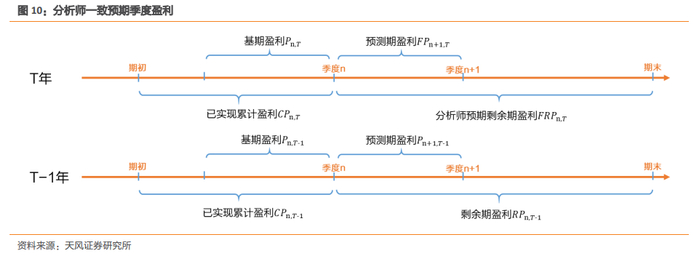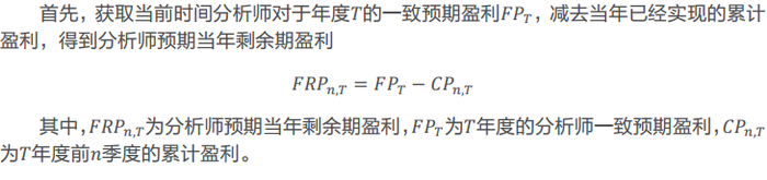 对于缺少业绩预告又无法通过规律外推模型进行估计的样本,如果分析师给出了公司的盈利预测,那么分析师预期就是一个相对可靠的盈利预测参考。然而,分析师通常仅给出年度盈利预测,因此需要将年度预测拆解为季度盈利预测。