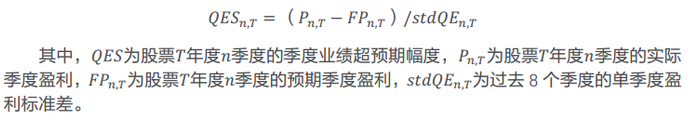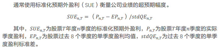 具体地,若公告(包括正式报告、业绩快报、业绩预告)发布前,公司发布了相应报告期的业绩预告,则根据业绩预告上限、下限均值确定盈利预期值。若缺少业绩预告,则按照前述流程确定预期季度盈利。其中,分析师一致预期取公告发布前三天的预期值。以公告业绩与预期业绩的差值衡量单季度业绩超预期幅度,并且参考标准化预期外盈利(SUE)的处理方式对超预期幅度进行标准化,即