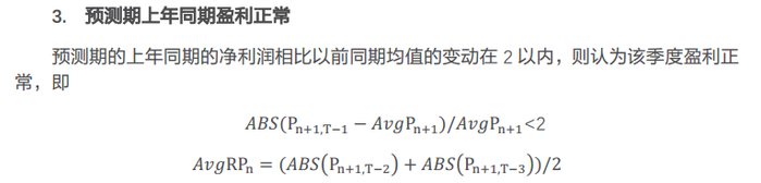 例如,当预测2019年三季度盈利时,需要判断预测期的上年同期(即2018年三季度)盈利是否正常,则将其与2017年三季度、2016年三季度的平均盈利进行比较。若变动幅度在2以内,则认为正常,否则为不正常。