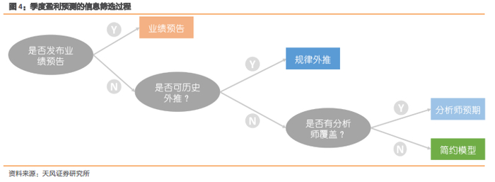 如下图所示,对于一个公司而言,若公司给出了盈利指引,则以业绩预告作为季度盈利预测值。其次,若其满足历史规律外推的条件,则以规律外推模型进行预测;若其不满足历史规律外推的条件,对于有分析师覆盖的公司,以分析师预期作为季度盈利预测,对于无分析师覆盖的公司,以简约模型作为季度盈利预测。