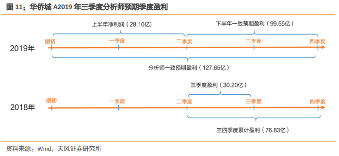 以华侨城A(000069)为例具体说明该方法的应用,如下图所示,从分析师一致预期净利润中获取其2019年三季度的预期季度盈利。2019年8月30日,分析师对该公司2019年净利润的一致预期为127.65亿。公司2019年上半年的归母净利润为28.10亿,因此下半年的一致预期净利润为127.65-28.10=99.55亿。2018年三季度扣非归母净利润为30.20亿,2018年四季度扣非归母净利润为46.64亿。2018年三季度占三、四季度累计盈利的比例为30.20/(30.20+46.64)=39.30%。假设2019年三季度占下半年的净利润比例保持不变,则2019年三季度的预期盈利为:99.55×39.30%=39.13亿。
