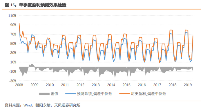 通过以上方法,可以得到系统化的季度盈利预测。为了考察该盈利预测体系的合理性,我们比较了每期预期盈利与实际盈利之间的差异。由于缺少可比较的季度盈利预测,我们与历史季度盈利进行比较。在每月末,计算预期季度盈利与实际盈利的偏差,即