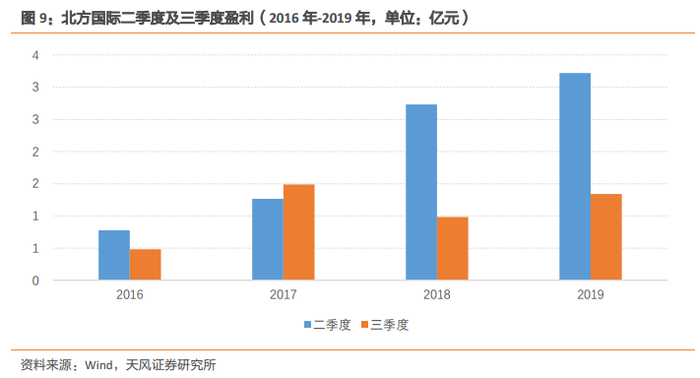 以北方国际(000065)为例。在2019年8月末,根据该公司二季度盈利预测三季度盈利。下图为该公司2016年至2019年间二季度及三季度的扣非归母净利润。该公司2019年二季度净利润同比增速为17.80%,则其基期盈利为正常。2016至2018年二季度占二、三季度累计盈利的比例分别为61.7%、45.9%、73.6%,平均占比为60.4%,相对均值的最大偏离为14.5%,大于10%,因此不满足历史盈利分布稳定的条件。其2016、2017年三季度盈利平均为(0.48+ 1.49)/2= 0.98亿元,2018年三季度盈利为0.98亿元,因此2018年三季度盈利正常,满足可历史外推的情形2(S2),应当使用平均增速模型。