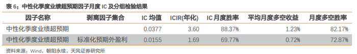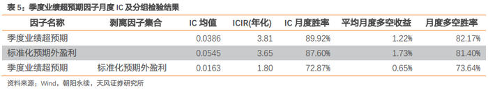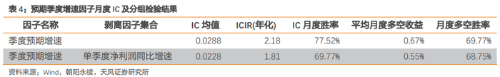 预期季度增速因子的IC均值为0.0288,年化ICIR为2.18,剔除单季度净利润同比增速因子后年化ICIR为1.81。