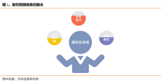 我们假设理性的投资者通过一套系统性地方法预测企业的未来盈利,同时公司业绩指引、分析师盈利预测也会作为其预测的参考。如下图所示,在三重信息的交融与相互影响下,投资者最终会获得一个相对合理的盈利预测。