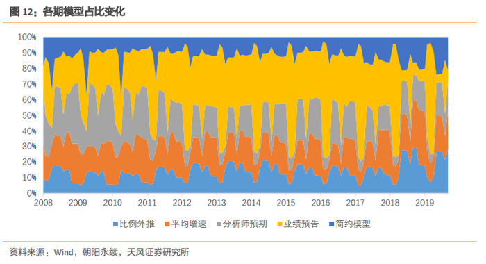 在1、2、3、7月,由于业绩预告的大量公布,平均55.89%的样本使用业绩预告所披露的数据,而在其余月份,业绩预告的占比大幅降低,平均为25.15%。同时可以注意到,在业绩预告比例较高的月份(1、2、3、7月),分析师预期的占比会相应降低,平均为10.70%;而在其余月份,分析师预期的占比平均为24.63%。剩余三个模型的占比在各月度间差异较小,其中比例外推模型的平均占比为13.85%,平均增速模型的平均占比为18.73%,简约模型的平均占比为11.94%。