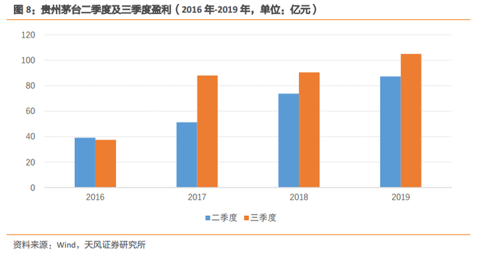 以贵州茅台(600519)为例。在2019年8月末,根据该公司二季度盈利预测三季度盈利。下图为该公司2016年至2019年间二季度及三季度的扣非归母净利润。2019年二季度同比增速为18.39%(决策树第一个判断条件满足)。2016年至2018年二季度占二、三季度累计盈利的比例分别为51.1%、36.8%、44.9%,历史平均占比为44.3%,净利润占比相对其平均值的最大偏离为7.5%,小于10%,则认为其历史盈利分布稳定,满足可历史外推的情形1(S1),应当使用比例外推模型。