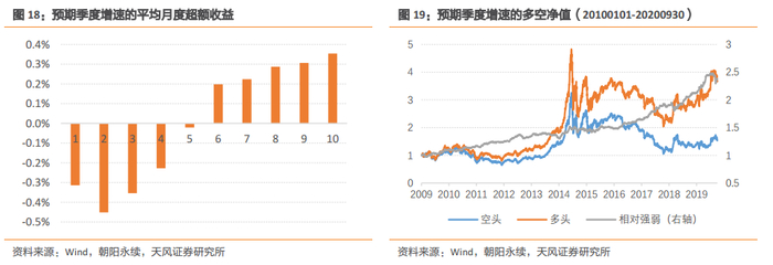 预期增速因子的分组收益单调,并且多头超额显著,平均月度多头超额收益为0.35%。