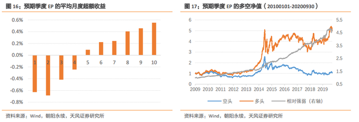 预期季度EP因子的分组收益呈现出良好的单调性,并且多头超额显著,平均月度多头超额收益为0.55%,多空相对强弱稳定向上。